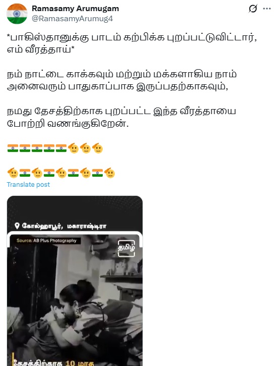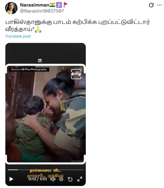 பாகிஸ்தானுடன் போருக்காக புறப்படும் ராணுவ வீரரான தாய் என்று வீடியோ ஒன்று சமூக வலைத்தளங்களில் பரவி வருகிறது.
