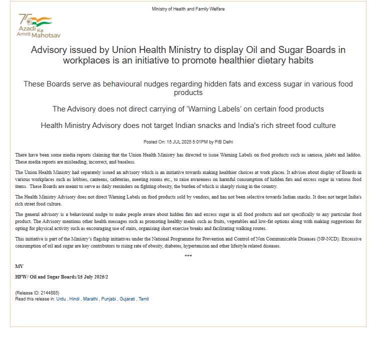 வைரலாகும் செய்தி குறித்து ஆராய்ந்தபோது ”சமோசா, ஜிலேபி ஆகிய உணவுப்பண்டங்களில் எச்சரிக்கை அறிவிப்புகள் இடம்பெற வேண்டும் என்று மத்திய சுகாதாரத்துறை அறிவித்ததாகப் பரவும் செய்தி தவறானது” என்று சுகாதாரம் மற்றும் குடும்பநலத்துறை வெளியிட்டுள்ள அறிக்கை நமக்குக் கிடைத்தது.