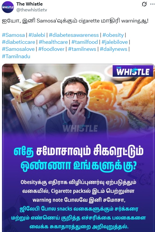 “Obesityக்கு எதிராக விழிப்புணர்வு ஏற்படுத்தும் வகையில், Cigarette packsல் இடம் பெற்றுள்ள warning note போலவே இனி சமோசா, ஜிலேபி போன்ற snacks வகைகளுக்கும் சர்க்கரை மற்றும் எண்ணெய் குறித்த எச்சரிக்கை பலகைகளை வைக்க சுகாதாரத்துறை அறிவுறுத்தல்” என்று இந்த செய்தி பரவுகிறது.