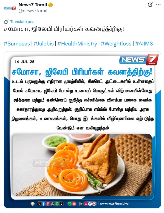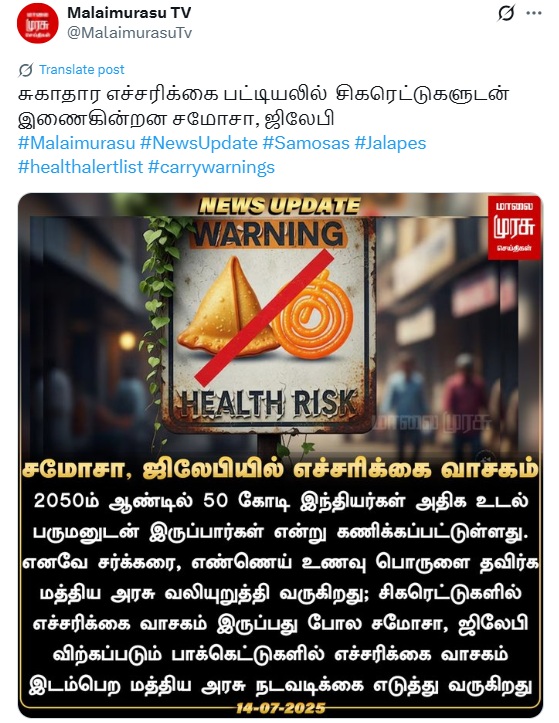 சமோசா, ஜிலேபியிலும் இனி எச்சரிக்கை வாசகங்கள் இடம்பெற வேண்டும் என்று சுகாதாரத்துறை அறிவித்துள்ளதாக செய்தி ஒன்று சமூக ஊடகங்களில் பரவி வருகிறது.
