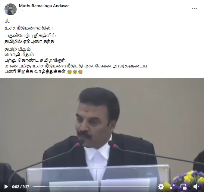 “உச்ச நீதிமன்றத்தில் பதவியேற்பு நிகழ்வில் தமிழில் ஏற்புரை தந்த தமிழ் மீதும் மொழி மீதும் பற்று கொண்ட தமிழறிஞர், மாண்புமிகு உச்ச நீதிமன்ற நீதிபதி மகாதேவன் அவர்களுடைய பணி சிறக்க வாழ்த்துக்கள்” என்று இந்த வீடியோ பரவி வருகிறது.