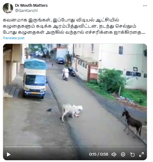 ”கவனமாக இருங்கள், இப்போது விடியல் ஆட்சியில் கழுதைகளும் கடிக்க ஆரம்பித்துவிட்டன. நடந்து செல்லும் போது கழுதைகள் அருகில் வந்தால் எச்சரிக்கை ஜாக்கிரதை” என்று இந்த வீடியோ பரவுகிறது.