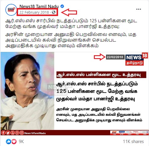 மேற்கு வங்கத்தில் மம்தா பானர்ஜி முதல்வராக பதவியேற்றப் பிறகு, ஆர்.எஸ்.எஸ் சார்பில் நடத்தப்படும் 125 பள்ளிகளை மூட உத்தரவிட்டதாக சமூக வலைத்தளங்களில் பரப்பப்படும் தகவல் தவறானது என்பதையும், இந்த உத்தராவானது மூன்று வருடங்களுக்கு முன்பு, 2018 ஆம் ஆண்டு இடப்பட்டது என்பதையும் உரிய ஆதாரங்களுடன் விளக்கியுள்ளோம்.