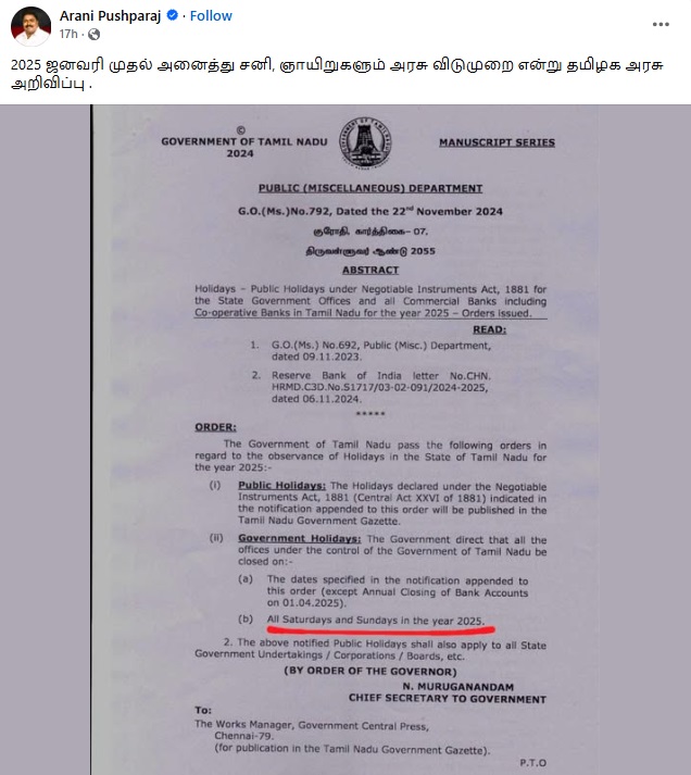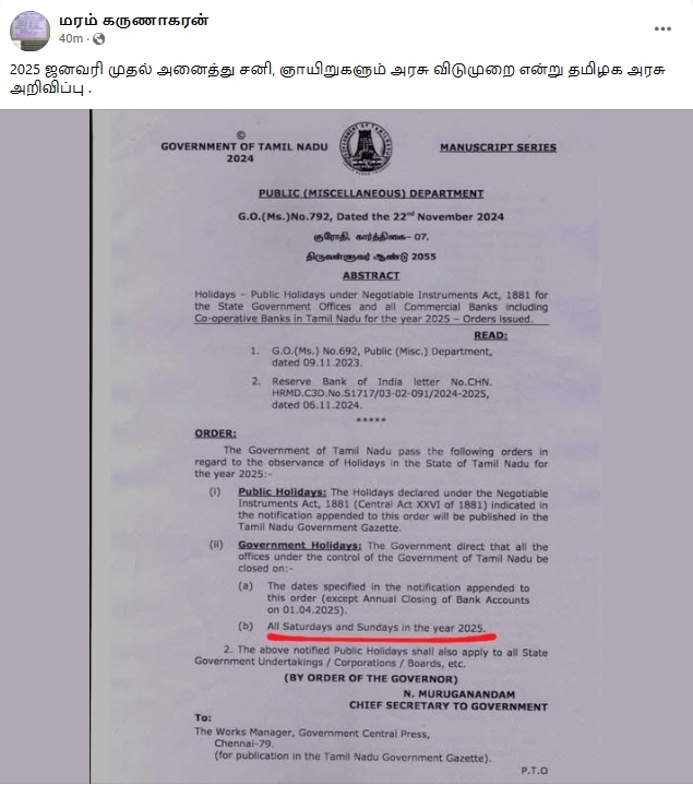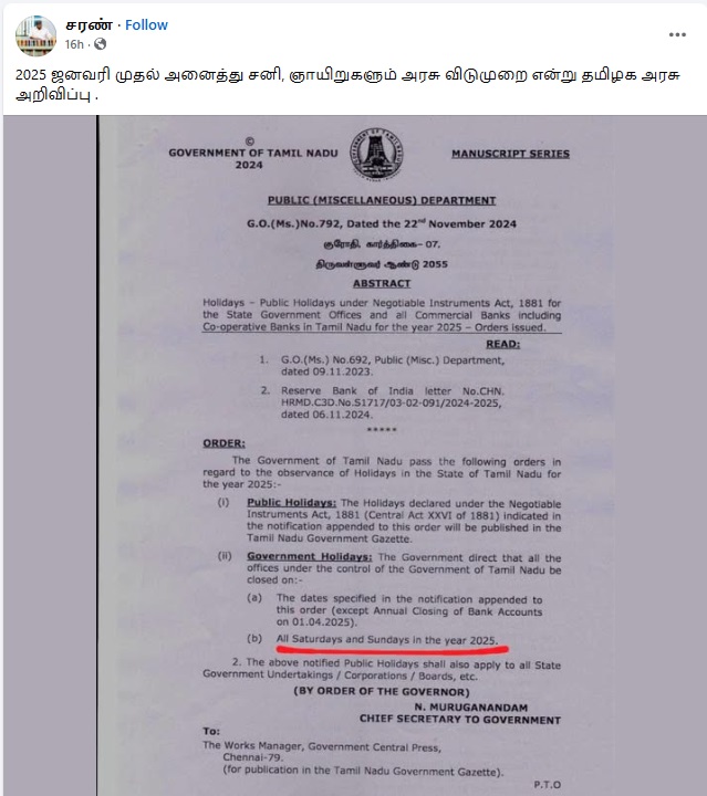 ”2025 ஜனவரி முதல் அனைத்து சனி, ஞாயிறுகளும் அரசு விடுமுறை என்று தமிழக அரசு அறிவிப்பு .” என்று இந்த செய்தி பரவுகிறது.