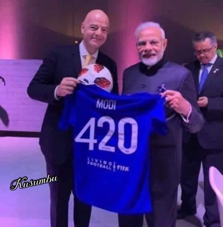 இந்தியப் பிரதமர் நரேந்திர மோடி அவர்களுக்கு FIFA தலைவர் ஜியானி இன்ஃபான்டினோ டி-சர்ட் ஒன்றை பரிசாக அளிப்பதாக புகைப்படம் ஒன்று வைரலாகி வருகின்றது. ஜியானி வழங்கிய அந்த டி-சர்ட்டில் மோடி 420 என்று எழுதப்பட்டிருந்தது.