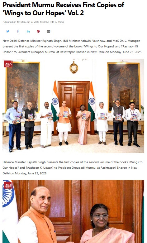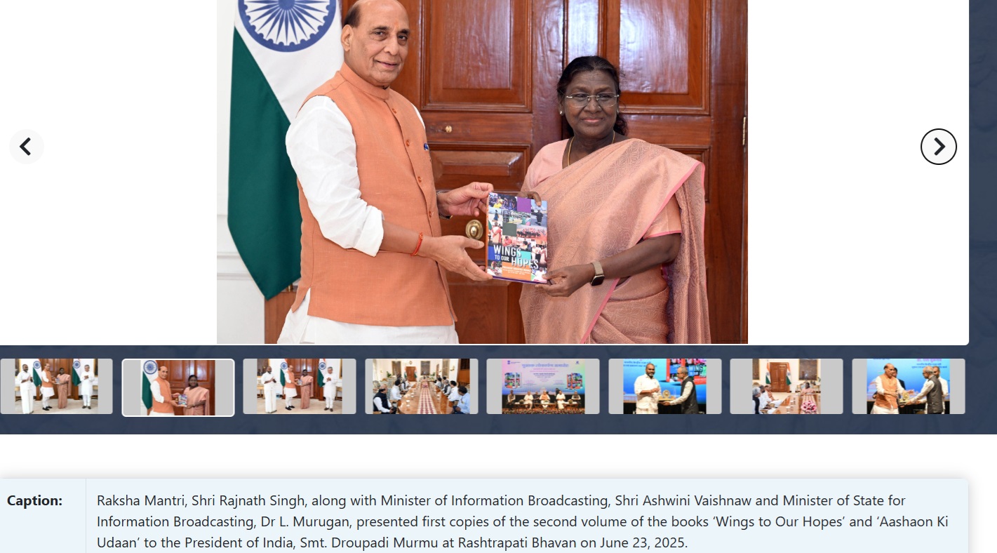 மேலும், ராஷ்ட்ரபதி பவன் அதிகாரப்பூர்வ இணையதளப்பக்கத்திலும் கடந்த ஜூன் 23, 2025 அன்று குடியரசு தலைவர் திரௌபதி முர்முவிற்கு மத்திய பாதுகாப்புத்துறை அமைச்சர் ராஜ்நாத் சிங் Wings to Our Hopes (Volume-II) என்கிற புத்தகத்தின் முதல் பிரதியை வழங்கினார். அப்போது, அமைச்சர்கள் அஷ்வினி வைஷ்ணவ் மற்றும் எல்.முருகன் ஆகியோரும் உடனிருந்தனர் என்பதாக புகைப்படத்தொகுப்பு வெளியாகியுள்ளது. அதிலும், இப்புகைப்படம் இடம்பெற்றுள்ளது.