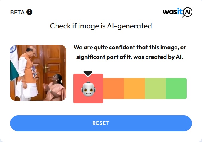 எனவே, பரவி வரும் வீடியோவைக் கீ-ப்ரேம்களாகப் பிரித்து Was It AI என்னும் செயற்கை நுண்ணறிவு காட்சிகளைக் கண்டறியும் இணையதளம் மூலமாக ஆராய்ந்தபோது வைரல் காட்சி AI மூலமாக உருவாக்கப்பட்டுள்ளது என்பது நமக்கு உறுதியாகியது.