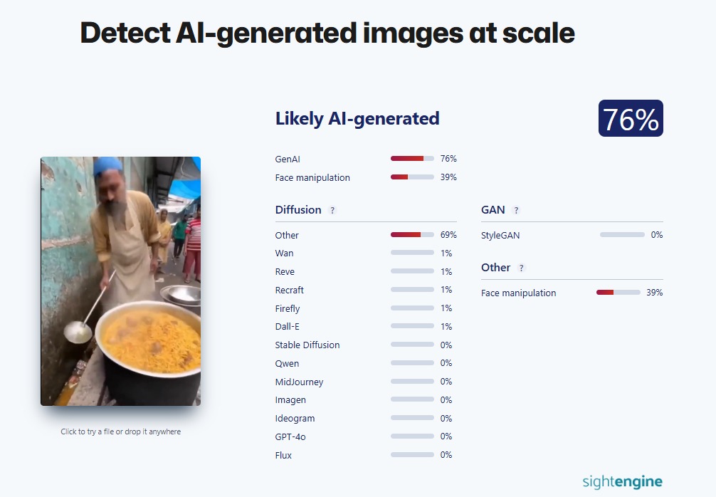மேலும், Sight Engine Tool மூலமாக இதனை ஆய்வு செய்தபோது 76% இந்த வீடியோ AI மூலமாக உருவாக்கப்பட்டது என்பது நமக்கு உறுதியாகியது.