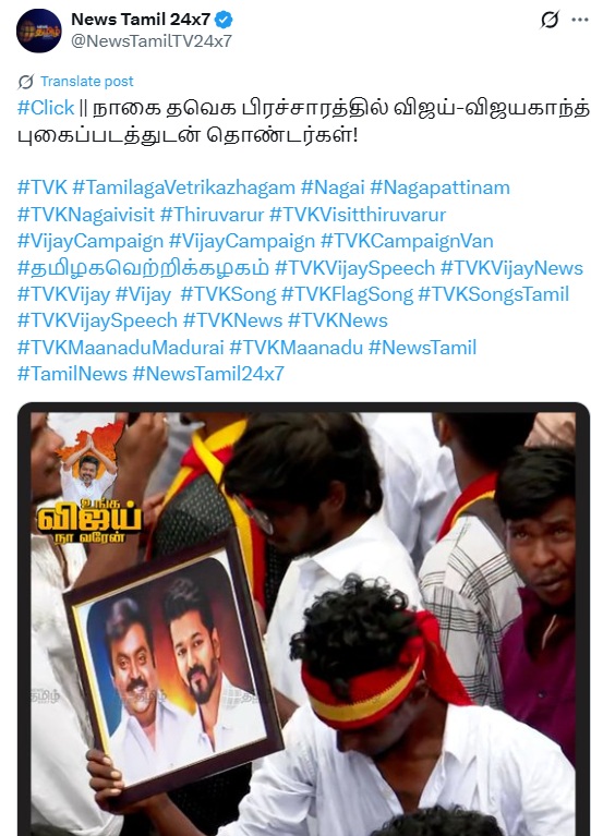 வைரலாகும் நியூஸ்கார்ட் Newstamil24x7 வெளியிட்டதாகப் பரவிய நிலையில் அவர்களுடைய அதிகாரப்பூர்வ சமூக வலைத்தளப்பக்கத்தில் ஆராய்ந்தபோது நாகை தவெக பிரச்சாரத்தில் விஜய் மற்றும் விஜயகாந்த் இணைந்திருக்கும் புகைப்படத்தை தொண்டர் ஒருவர் வைத்திருந்ததாக செய்தி புகைப்படம் வெளியாகியுள்ளது.