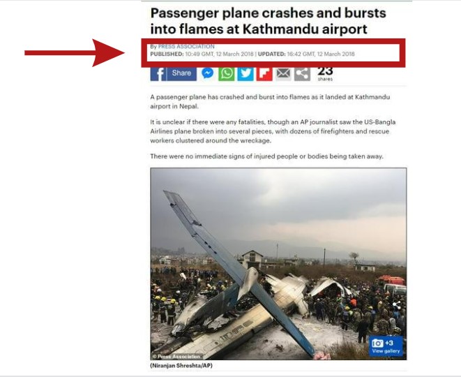 விமானம் சிதைந்து கிடப்பதாகப் பரவும் புகைப்படத்தை ரிவர்ஸ் சர்ச் செய்தபோது CNN கடந்த மார்ச் 12, 2018ல் வெளியிட்டிருந்த “49 dead in plane crash at Nepal’s Kathmandu airport.” என்கிற செய்தி நமக்குக் கிடைத்தது. அதில், இப்புகைப்படம் “At least 49 people were killed when a plane approached the runway from the wrong direction, crashed and burst into flames while landing at Kathmandu’s Tribhuvan Airport in Nepal…Flight BS 211, which belongs to US-Bangla Airlines, a privately owned Bangladeshi carrier, was flying from Dhaka, Bangladesh, police spokesperson Manoj Neupane said.” என்கிற செய்தியுடன் இடம்பெற்றுள்ளது. மார்ச் 12, 2018 Daily Mail செய்தியிலும் இப்புகைப்படம் இடம்பெற்றுள்ளது.