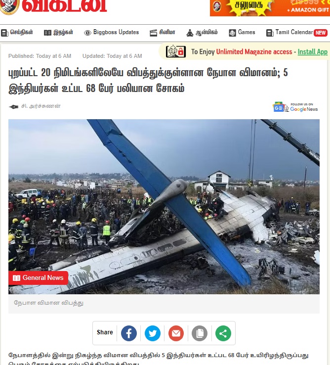 நேபாள தலைநகர், காத்மாண்டுவில் இருந்து பொக்ராவிற்கு 72 பயணிகளுடன் ஞாயிறு (15/01/2023) காலை கிளம்பிய Yeti ஏர்லைன்ஸ் விமானம் பயங்கர விபத்துக்கு உள்ளானது. அதில் பயணம் செய்தவர்களில் கிட்டதட்ட 60க்கும் மேற்பட்டோர் உயிரிழந்துள்ளனர்.