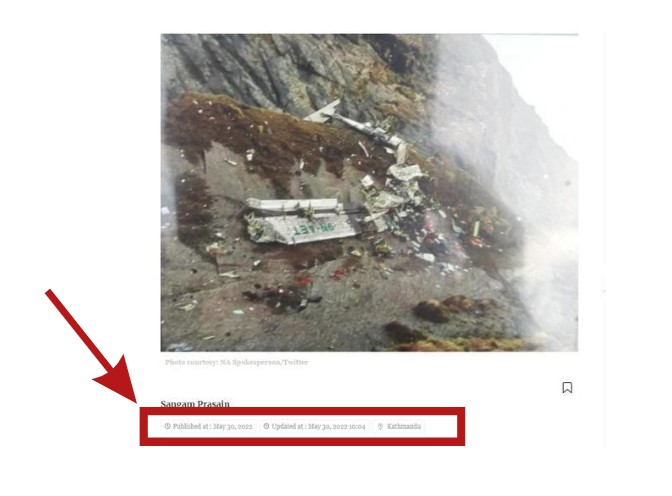 சிதைந்த விமானத்தின் எச்சங்கள் இடம்பெற்றுள்ள இப்புகைப்படத்தை ரிவர்ஸ் சர்ச் முறைக்கு உள்ளாக்கியபோது “காத்மாண்டு போஸ்ட்” கடந்த மே 20, 2022 வெளியிட்டிருந்த செய்தி நமக்குக் கிடைத்தது. அதில் இப்புகைப்படம் இடம் பெற்றுள்ளது. “Rescuers pulled out 14 bodies from the crash site of Tara Air and have been scouring the area for the remains of the others, according to rescuers. Pieces of wreckage of the passenger plane that crashed on Sunday morning were found at 14,500ft in Sano Sware Bhir of Thasang in Mustang district in northwestern Nepal, after nearly 20 hours since the plane went missing, the Nepal Army…The Twin Otter aircraft of Tara Air with 22 people onboard, including three members of the crew, had slammed into a mountain.” என்கிற செய்தியுடன் இப்புகைப்படம் இடம்பெற்றுள்ளது.