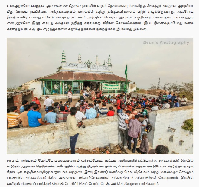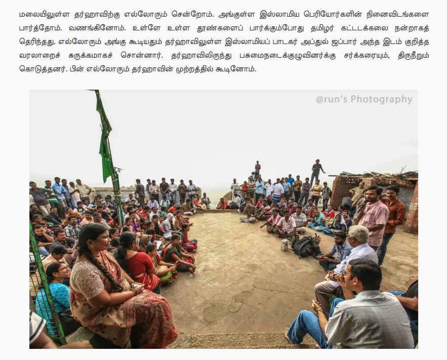 மேலும், வேல்முருகன் என்பவரது வலைப்பூவில் “திருப்பரங்குன்றம் மலைமீது உள்ள சிக்கந்தர் தர்ஹா பயணம்” என்கிற தலைப்பில் கடந்த பிப்ரவரி 21, 2014 அன்று வெளியாகியுள்ள கட்டுரையில் திருப்பரங்குன்றம் சிக்கந்தர் தர்ஹா பசுமை நடை நிகழ்வு குறித்த பல்வேறு புகைப்படங்கள் இடம்பெற்றுள்ளன. அதில் இடம்பெற்றுள்ள புகைப்படம் ஒன்றின் காட்சிகளும், வைரல் புகைப்படக் காட்சிகளும் ஒன்றே என்பதை நம்மால் அறிந்து கொள்ள முடிந்தது.