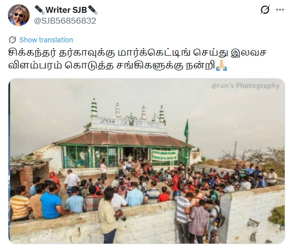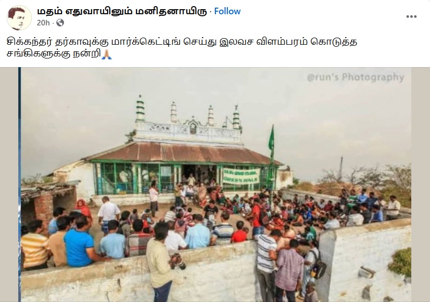 ” சிக்கந்தர் தர்காவுக்கு மார்க்கெட்டிங் செய்து இலவச விளம்பரம் கொடுத்த சங்கிகளுக்கு நன்றி” என்று இந்த புகைப்படம் பரவுகிறது.