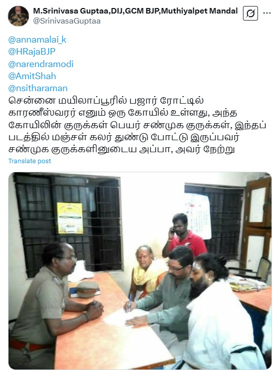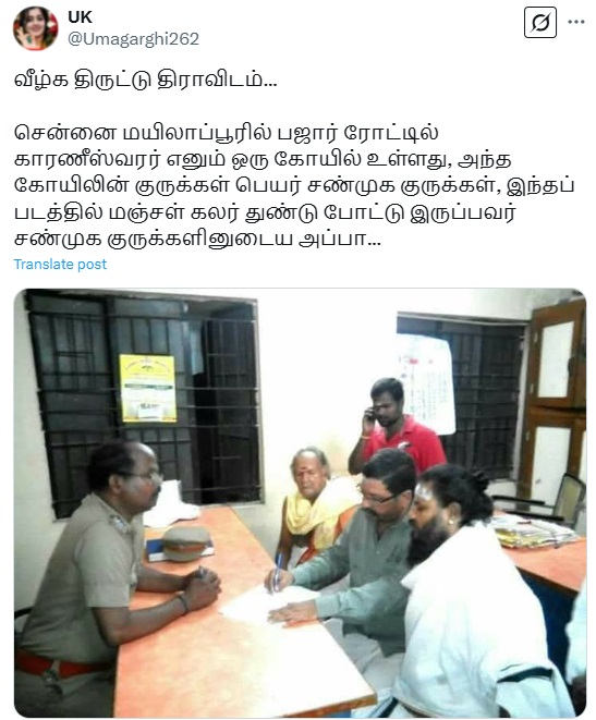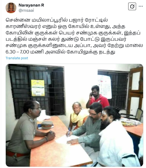“சென்னை மயிலாப்பூரில் பஜார் ரோட்டில் காரணீஸ்வரர் எனும் ஒரு கோயில் உள்ளது, அந்த கோயிலின் குருக்கள் பெயர் சண்முக குருக்கள்……..வர் நேற்று மாலை கோவிலுக்கு சென்று கொண்டிருந்த போது சுமார் 6- 6.30 மணி அளவில்….தி.க-வினைச் சேர்ந்த சுமார் 20 நபர்கள் பைக்கில் வந்து அவருடைய பூணூலினை அறுத்து எறிந்துவிட்டு, அவரை அடித்து கீழே தள்ளிவிட்டுச் சென்றுவிட்டனர்” என்பதாக மேலும் தகவலுடன் இந்த பதிவு சமூக வலைத்தளத்தில் பரவுகிறது.