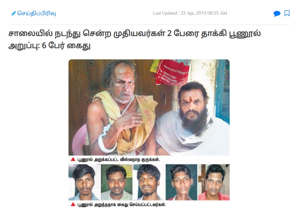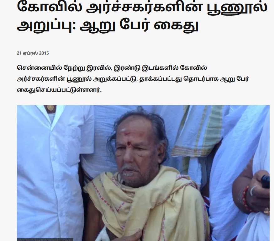 இந்த சம்பவம் குறித்து மேலும் ஆராய்ந்தபோது, “கடந்த ஏப்ரல் 20, 2015 அன்று இரவு சென்னை மைலாப்பூரில் வசித்து வந்த விஸ்வநாத குருக்கள் என்பவரை மோட்டார் சைக்கிளில் வந்த சில நபர்கள் தாக்கி அவரது பூணூலை அறுத்ததாகத் தெரிகிறது.