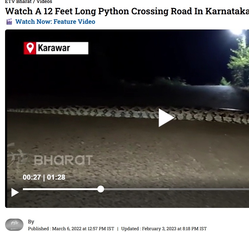மேலும், கடந்த மார்ச் 06, 2022 அன்று ETVBharat வெளியிட்டிருந்த செய்தியில் இந்த மலைப்பாம்பு குறித்து ”Watch a 12 feet long python crossing road in Karnataka’s Karwar” என்று அது கர்நாடகாவில் சாலையைக் கடந்ததாக தெரிவிக்கப்பட்டிருந்தது.