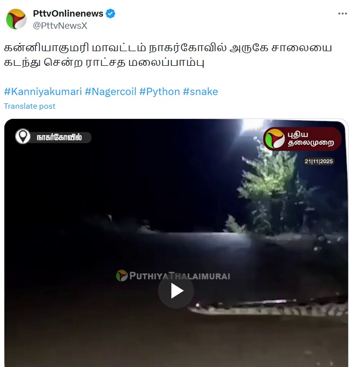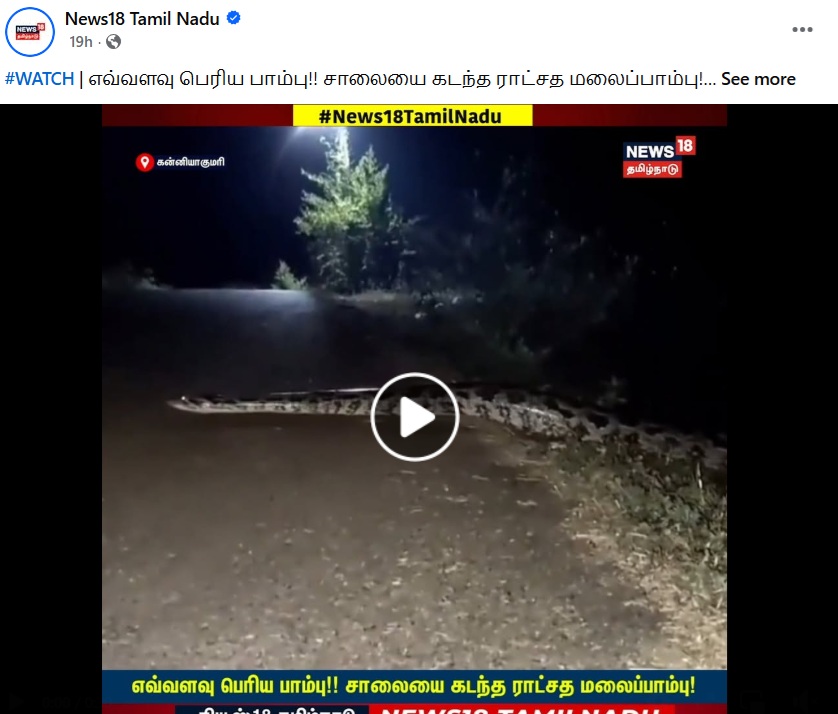 ”கன்னியாகுமரி மாவட்டம் நாகர்கோவில் அருகே சாலையை கடந்து சென்ற ராட்சத மலைப்பாம்பு” என்று புதியதலைமுறை உள்ளிட்ட பல்வேறு ஊடகங்களும் இந்த வீடியோவை வெளியிட்டுள்ளன.