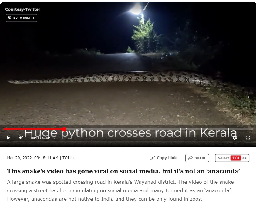 தொடர்ந்து, இந்த வீடியோ காட்சி குறித்து ஆராய்ந்தபோது கடந்த மார்ச் 20, 2022 அன்று Times of India வெளியிட்டிருந்த “This snake’s video has gone viral on social media, but it’s not an ‘anaconda’” என்கிற செய்தியில் இந்த வீடியோ காட்சி இடம்பெற்றிருந்தது. அதன்படி, கேரளா வயநாட்டில் இந்த மலைப்பாம்பு சாலையைக் கடந்ததாக தெரிவிக்கப்பட்டிருந்தது.