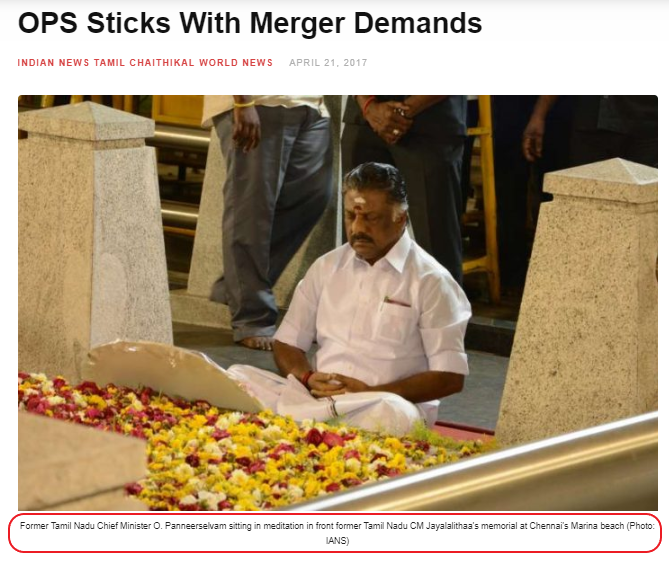 இத்தேடலில் ‘OPS Sticks With Merger Demands’ என்று தலைப்பிட்டு ஏசியன் லைட் எனும் ஊடகம் வெளியிட்டிருந்த செய்தியில் ஓபிஎஸ் தியானம் செய்யும் படத்தை பயன்படுத்தி இருந்ததை காண முடிந்தது. அப்படத்தின் கீழ், “Former Tamil Nadu Chief Minister O. Panneerselvam sitting in meditation in front former Tamil Nadu CM Jayalalithaa’s memorial at Chennai’s Marina beach (முன்னாள் சென்னை மெரினா கடற்கரையில் உள்ள முதல்வர் ஜெயலலிதாவின் சமாதியின் முன் ஓ.பன்னீர்செல்வம் தியானம் செய்தார்)“என்று குறிப்பிடப்பட்டிருந்தது.
