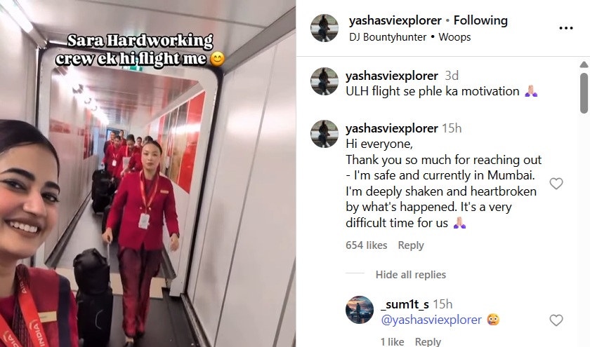 அதுமட்டுமின்றி, அந்த வீடியோவின் கமெண்ட் பகுதியிலேயே அவர், “Hi everyone,Thank you so much for reaching out – I’m safe and currently in Mumbai. I’m deeply shaken and heartbroken by what’s happened. It’s a very difficult time for us” என்று பதிவிட்டுள்ளார்.