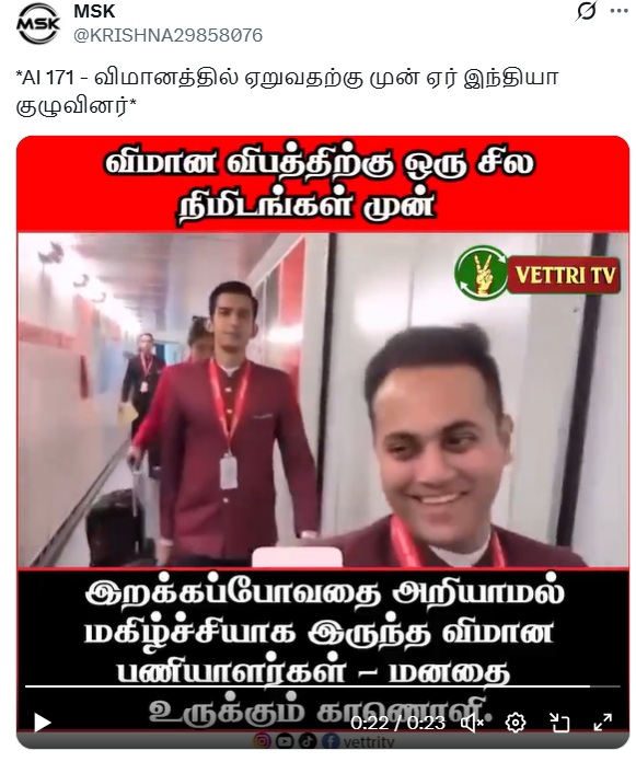 அகமதாபாத் விமான விபத்தில் உயிரிழந்த ஏர் இந்தியா குழுவினரின் கடைசி வீடியோ என்று வீடியோ ஒன்று சமூக வலைத்தளங்களில் பரவி வருகிறது.