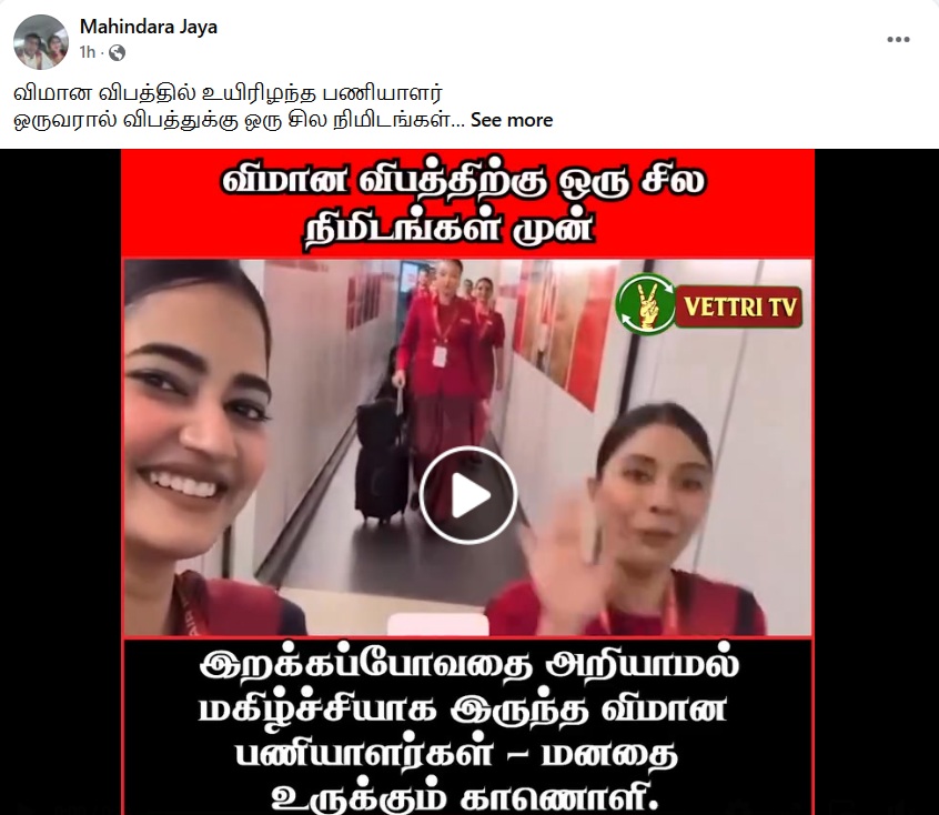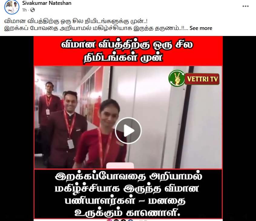 அகமதாபாத் விமான விபத்தில் உயிரிழந்த ஏர் இந்தியா குழுவினரின் கடைசி வீடியோ என்று பரவும் காட்சி குறித்த உண்மையறிய அதுபற்றிய ஆய்வில் ஈடுபட்டோம்.