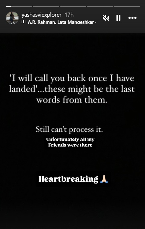 மேலும், அவருடைய சமூக வலைத்தளப்பக்கத்தின் ஸ்டோரி பகுதியில் உயிரிழந்த விமானப்பணியாளர்களுக்கு அஞ்சலி செலுத்தியிருப்பதுடன், அவர்களுடன் பணிபுரிந்த தனது நினைவுகளையும் பகிர்ந்துள்ளார்.
