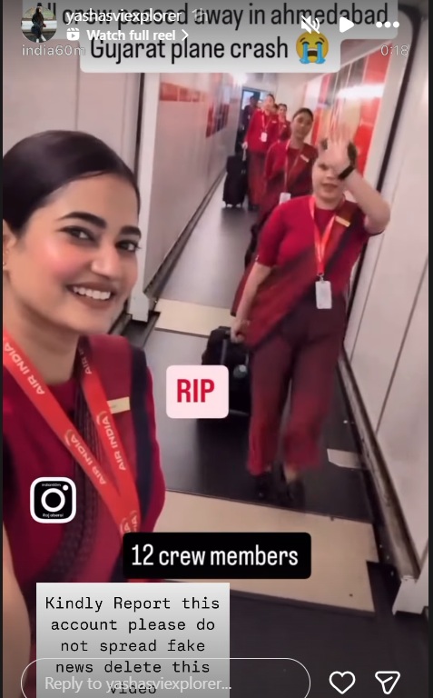 வைரலாகும் வீடியோ யாஷஸ்வி ஷர்மா என்கிற விமானப்பணிப்பெண்ணால் ஜூன் 9ஆம் தேதியன்று பதிவிடப்பட்டுள்ளது. அதற்கும், அகமதாபாத் விமான விபத்திற்கும் எந்த தொடர்பும் இல்லை.