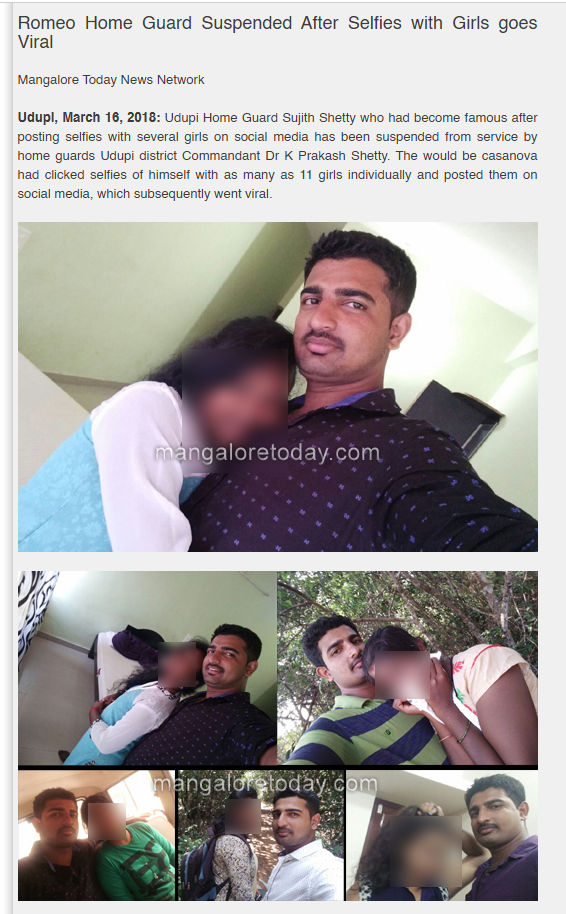 கர்நாடக மாநிலம் உடுப்பியில் ஊர்க்காவல் படையை சார்ந்த சுஜித் ஷெட்டி என்பவர் பல பெண்களுடன் ஜோடியாக சேர்ந்து புகைப்படம் எடுத்து சமூக ஊடகங்களில் பகிர்ந்துள்ளார். அப்படங்கள் வைரலானதை தொடர்ந்து சுஜித் தற்காலிக பணியிடை நீக்கம் செய்யப்பட்டதாக அச்செய்தியில் தெரிவிக்கப்பட்டிருந்தது.