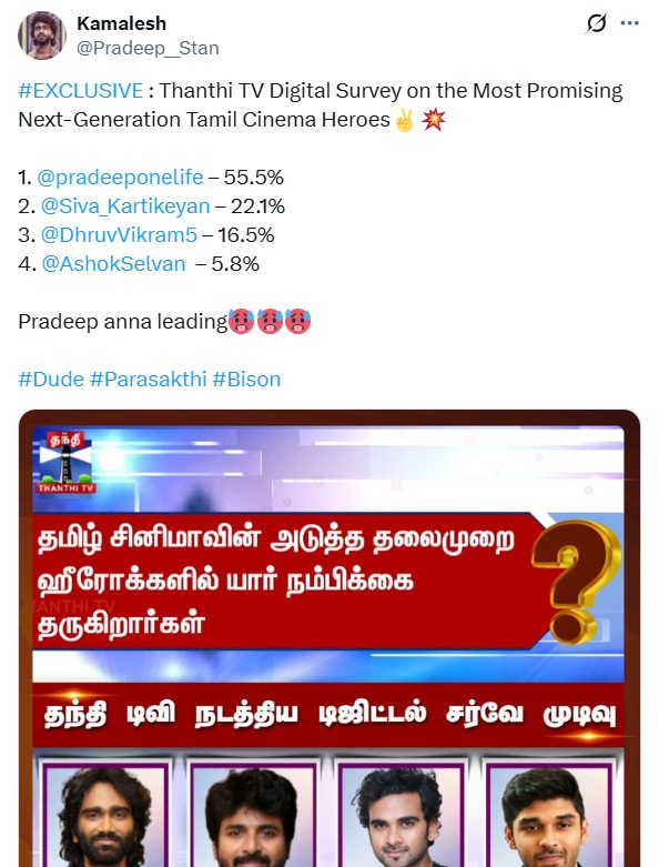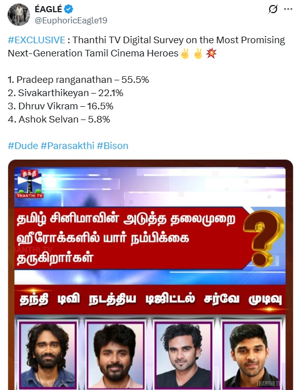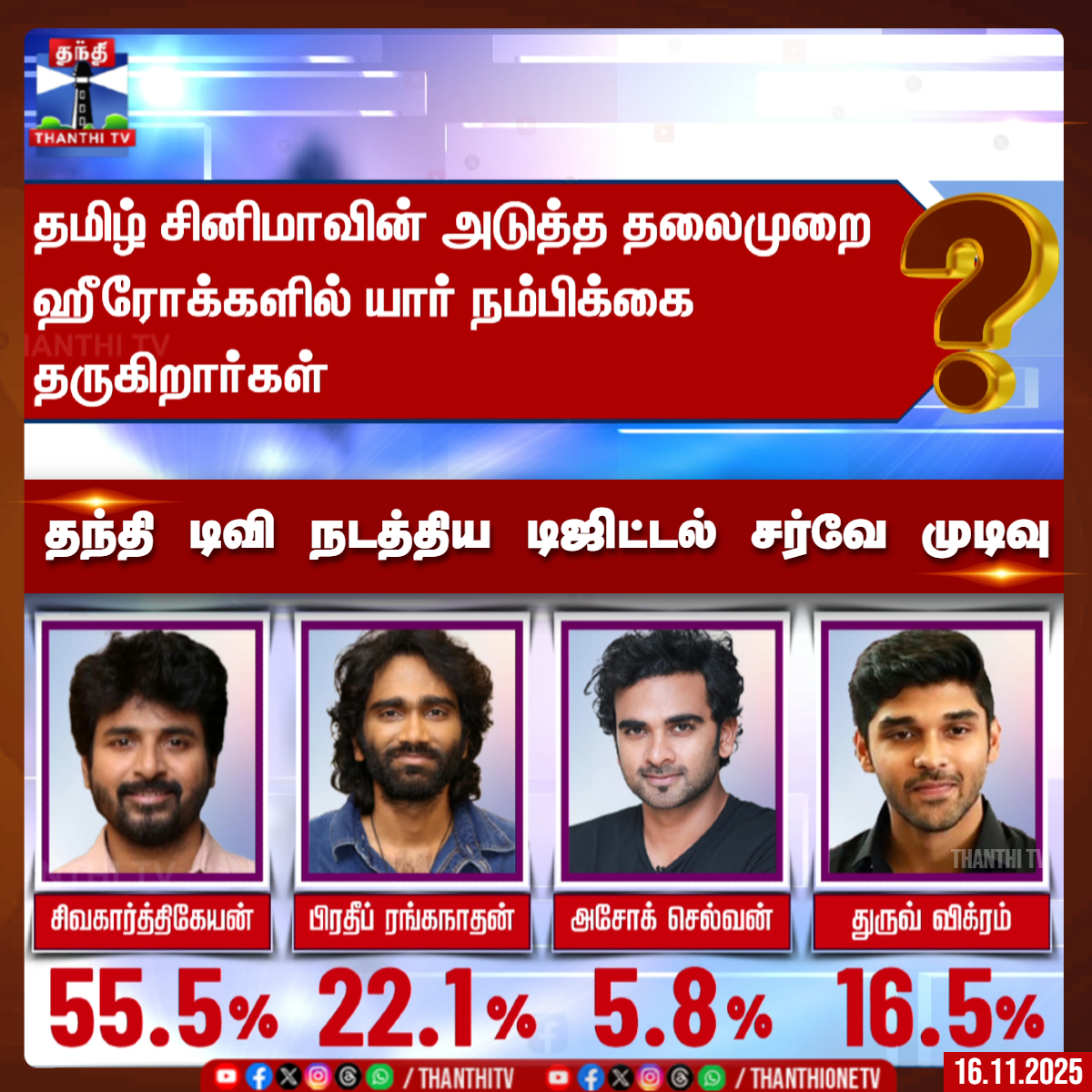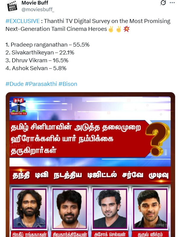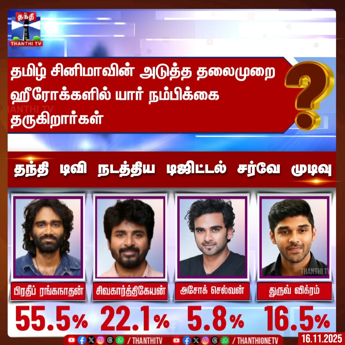 ”Thanthi TV Digital Survey on the Most Promising Next-Generation Tamil Cinema Heroes. 1. Pradeep ranganathan – 55.5% 2. Sivakarthikeyan – 22.1% 3. Dhruv Vikram – 16.5% 4. Ashok Selvan – 5.8%” என்று இந்த நியூஸ்கார்ட் பரவுகிறது.