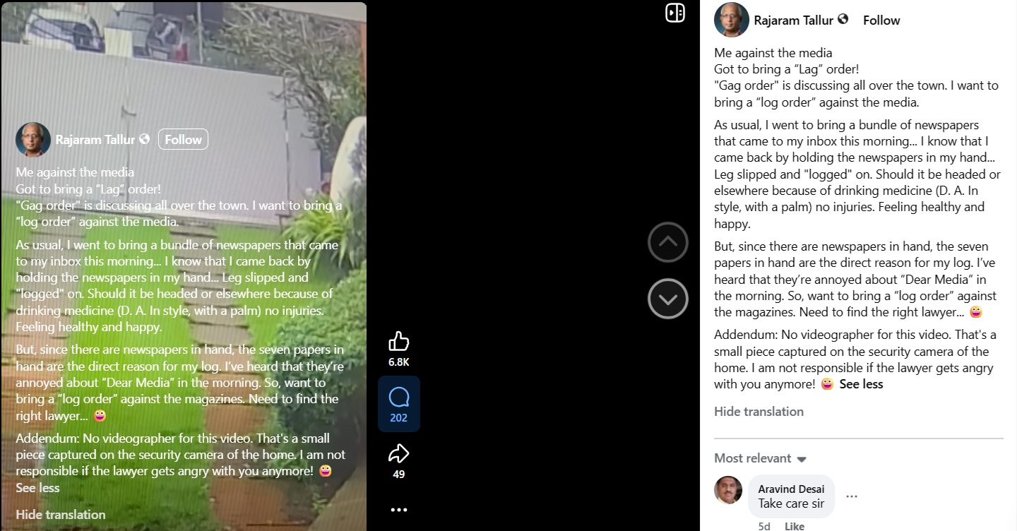 மேலும், அதில் அன்றைய நாளிதழ்களை வீட்டு வாயிலில் எடுக்கச் சென்றபோது அவர் தவறி விழுந்த நிகழ்வை நகைச்சுவையாக பதிவிட்டிருந்தார். என்னுடைய வீட்டு பாதுகாப்பு கேமராவில் இந்த காட்சி பதிவானது என்றும் பதிவிட்டிருந்தார்.