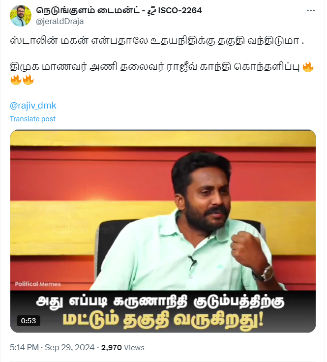 X post from Rajiv Gandhi, Student Wing, President, DMK, Dated September 30, 2024