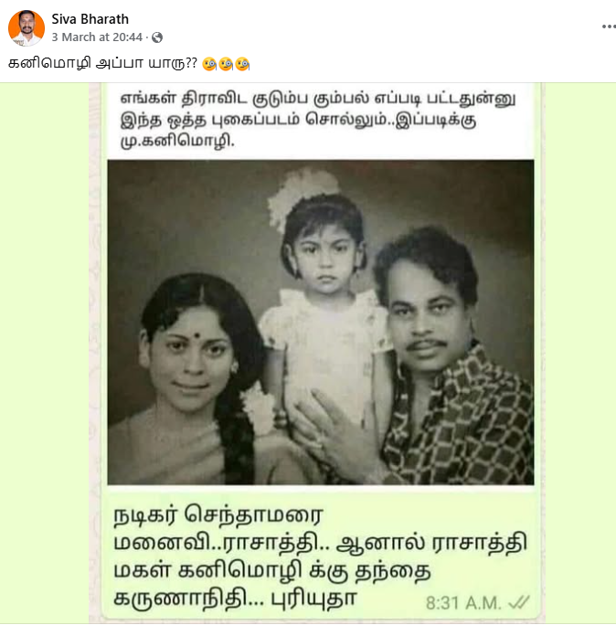 இத்தேடலில் ஏசியா நெட் நியூஸ் தமிழ் இணையத்தளம் வெளியிட்டிருந்த செய்தி ஒன்றில் கருணாநிதி, ராசாத்தி அம்மாள், மற்றும் கனிமொழி (சிறுமியாக) இருக்கும் பழைய படம் ஒன்று பயன்படுத்தப்பட்டிருந்ததை காண முடிந்தது.