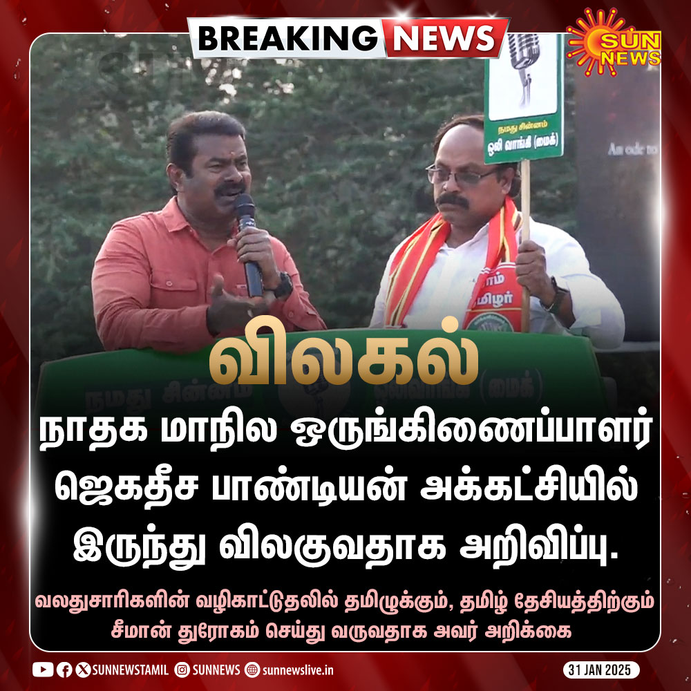 வைரலாகும் நியூஸ்கார்ட் சன் நியூஸ் வெளியிட்டதாகப் பரவிய நிலையில் அவர்களுடைய அதிகாரப்பூர்வ சமூக வலைத்தளப்பக்கத்தை ஆராய்ந்தோம். அப்போது, அதில் “நாதக மாநில ஒருங்கிணைப்பாளர் ஜெகதீச பாண்டியன், கட்சியில் இருந்து விலகல்” என்று இந்த நியூஸ்கார்ட் இடம்பெற்றிருந்தது.