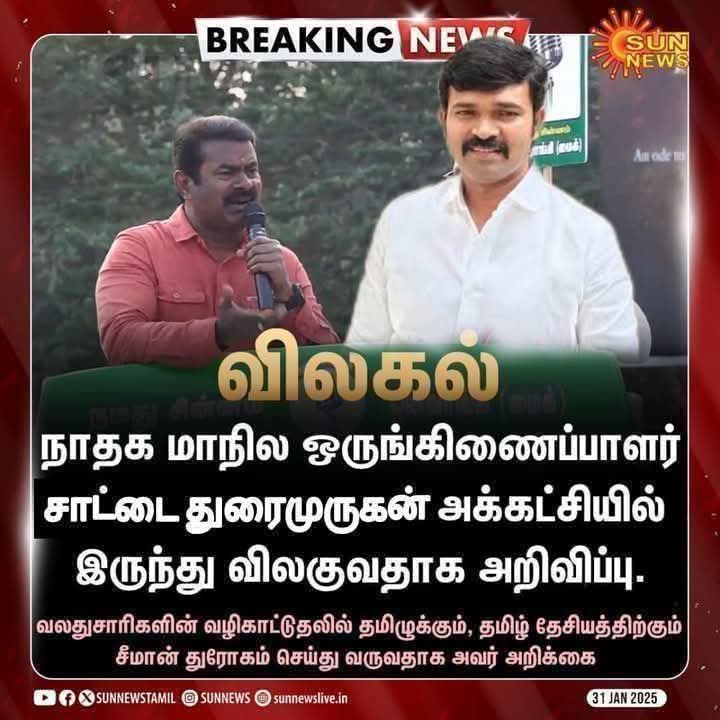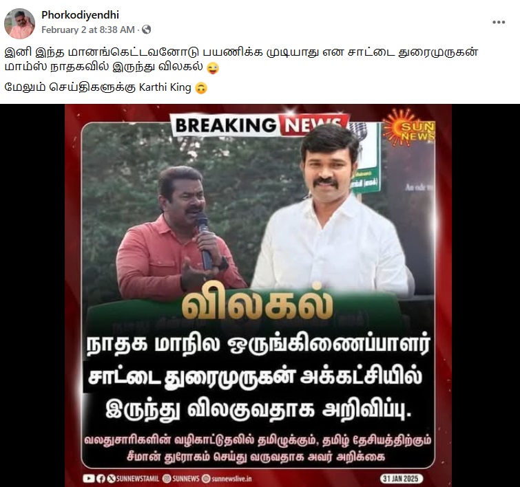 ”நாதக மாநில ஒருங்கிணைப்பாளர் சாட்டை துரைமுருகன் அக்கட்சியில் இருந்து விலகுவதாக அறிவிப்பு. வலதுசாரிகளின் வழிகாட்டுதலில் தமிழுக்கும், தமிழ் தேசியத்திற்கும் சீமான் துரோகம் செய்து வருவதாக அவர் அறிக்கை” என்று இந்த நியூஸ்கார்ட் பரவி வருகிறது.