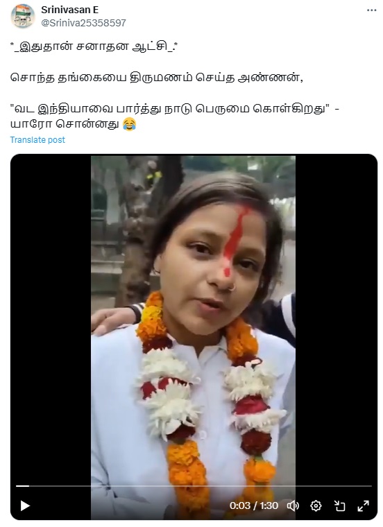 “இதுதான் சனாதன ஆட்சி. சொந்த தங்கையை திருமணம் செய்த அண்ணன். வட இந்தியாவை பார்த்து நாடு பெருமை கொள்கிறது” – யாரோ சொன்னது” என்று இந்த வீடியோ பரவுகிறது.