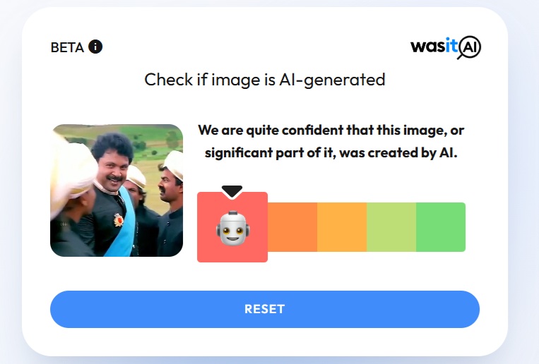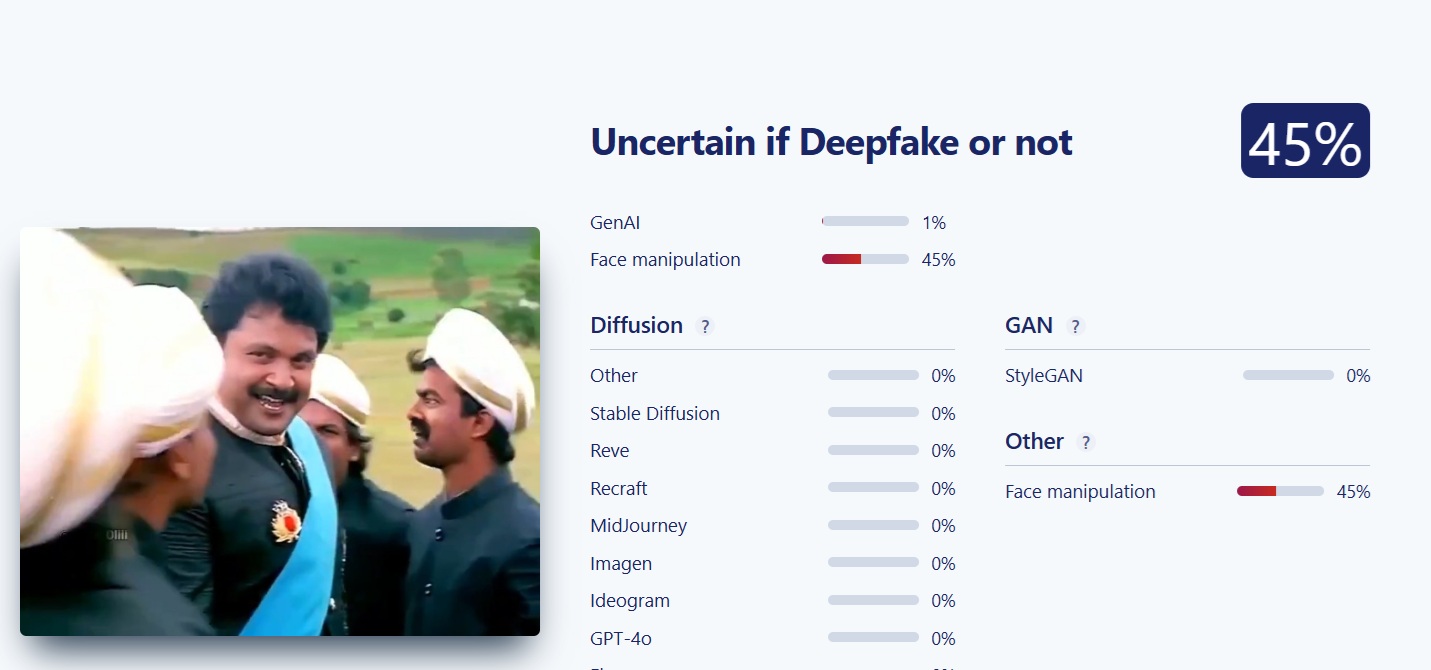 வைரலாகும் பாடலில் சீமான் முகம் இடம்பெற்றுள்ள காட்சிகளை கீ-ப்ரேம்களாகப் பிரித்து WasitAI மற்றும் Sight Engine tool மூலமாக ஆராய்ந்தபோது குறிப்பிட்ட சில இடங்களில் AI எடிட் உபயோகப்படுத்தப்பட்டுள்ளது என்பதும், Face Manipulation செய்யப்பட்டுள்ளது என்பதும் நமக்கு உறுதியாகியது.