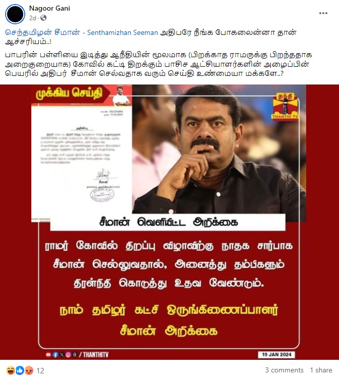 Claim: ராமர் கோவில் திறப்பு விழாவிற்கு நாதக சார்பாக சீமான் செல்லுவதால், அனைத்து தம்பிகளும் திரள்நிதி கொடுத்து உதவ வேண்டும். ஒருங்கிணைப்பாளர் சீமான் அறிக்கை