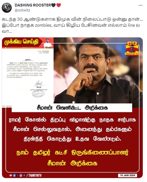 ”ராமர் கோவில் திறப்பு விழாவிற்கு நாதக சார்பாக சீமான் செல்லுவதால், அனைத்து தம்பிகளும் திரள்நிதி கொடுத்து உதவ வேண்டும். ஒருங்கிணைப்பாளர் சீமான் அறிக்கை” என்று இந்த நியூஸ்கார்ட் பரவுகிறது.