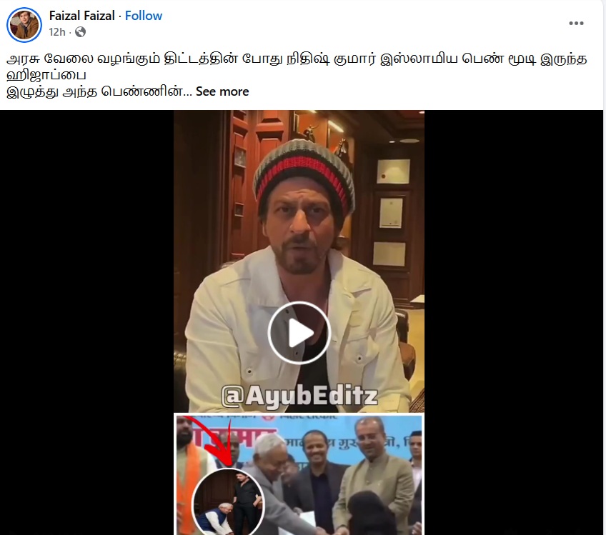 இஸ்லாமியப் பெண் மருத்துவரின் ஹிஜாபை அகற்றிய பீகார் முதல்வர் நிதிஷ் குமாருக்கு நடிகர் ஷாருக்கான் கண்டனம் தெரிவித்ததாக வீடியோ ஒன்று சமூக வலைத்தளங்களில் பரவி வருகிறது.