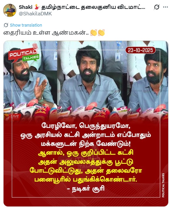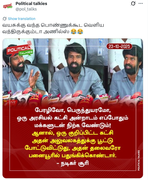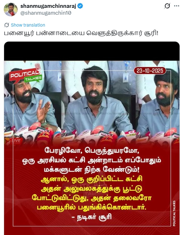 ஆனால், ஒரு குறிப்பிட்ட கட்சி அதன் அலுவலகத்துக்கு பூட்டு போட்டுவிட்டுது, அதன் தலைவரோ பனையூரில் பதுங்கிக்கொண்டார். -நடிகர் சூரி” என்று இந்த நியூஸ்கார்ட் பரவுகிறது.