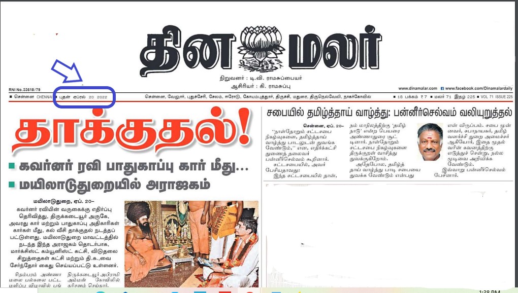 இருப்பினும் பலர் இதை உண்மை என்று பகிர்ந்து வருவதால் இச்செய்தியை தினமலர் வெளியிட்டதா என்று தேடினோம். வைரலாகும் படத்தில் இச்செய்தியானது கடந்த புதனன்று (20/04/2022) முகப்பு பக்கத்தில் வெளிவந்ததாக குறிப்பிடப்பட்டுள்ளது.
