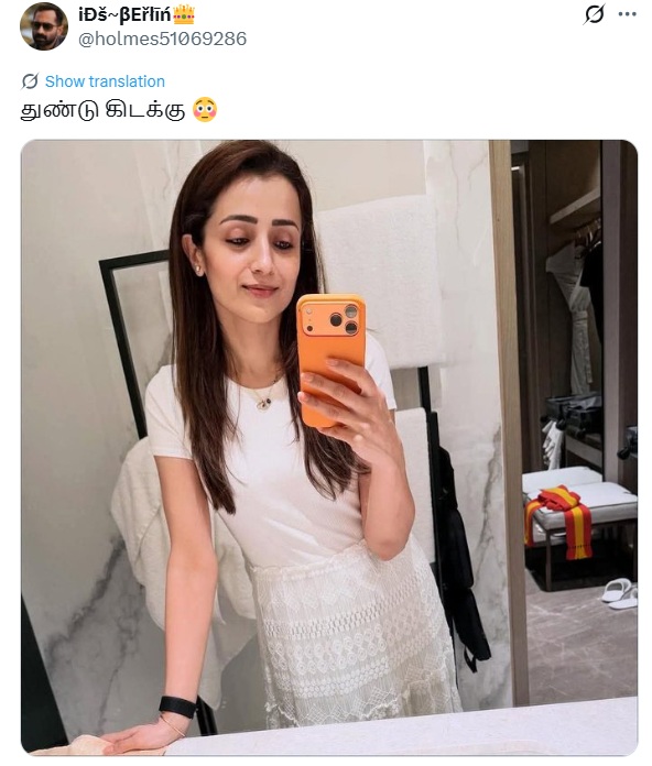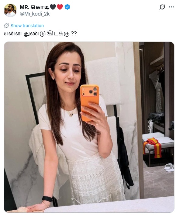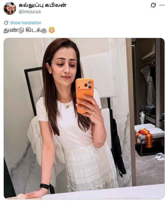 திரிஷாவின் செல்ஃபி போட்டோவின் பின்புறம் தவெக துண்டு கிடப்பதாகப் புகைப்படம் ஒன்று சமூக வலைத்தளங்களில் பரவி வருகிறது.