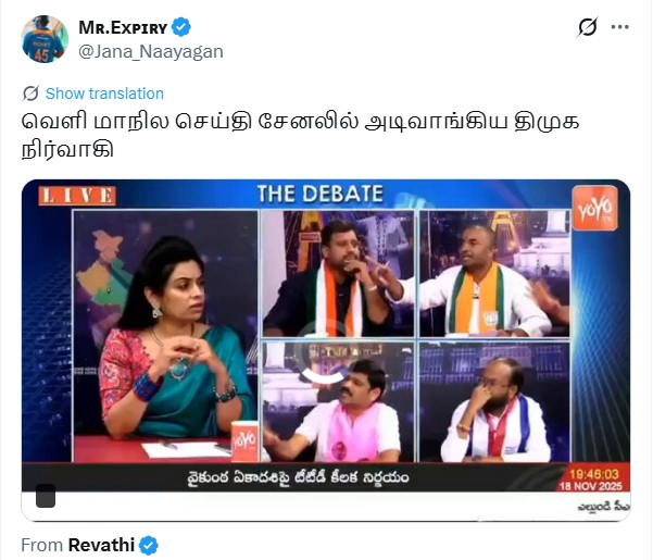 தொலைக்காட்சி விவாத நிகழ்ச்சி ஒன்றில் அடி வாங்கிய திமுக பிரமுகர் என்று வீடியோ ஒன்று சமூக வலைத்தளங்களில் பரவி வருகிறது.