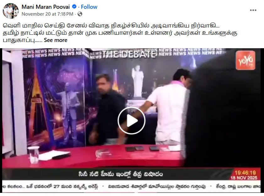 ”வெளி மாநில செய்தி சேனலில் அடிவாங்கிய திமுக நிர்வாகி” என்று இந்த வீடியோ பரவுகிறது.