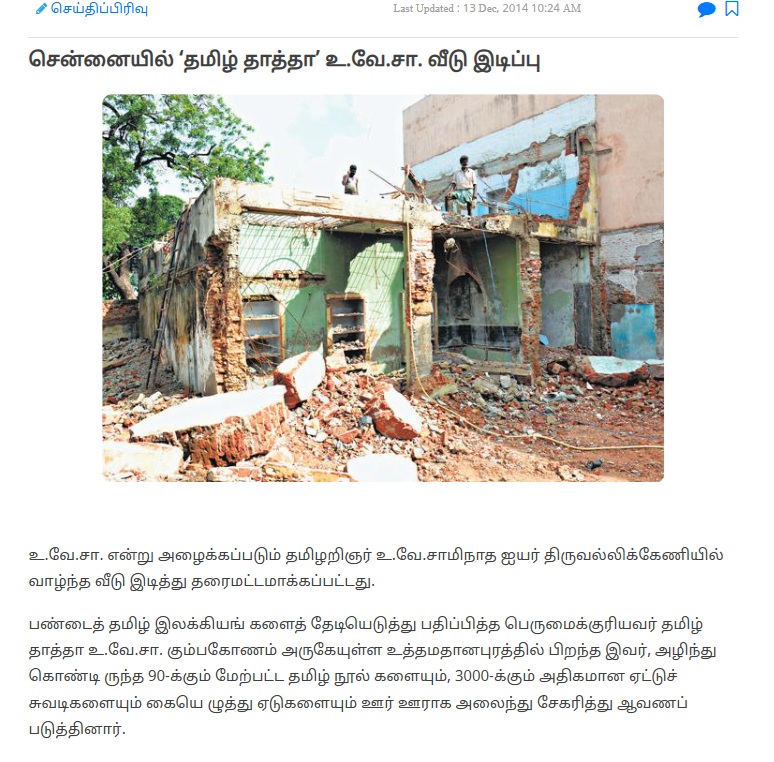 மேலும், குறிப்பிட்ட வீட்டினை அவரது வாரிசுகள் வேறொருவரிடம் விற்ற நிலையில், அந்த தனிநபரே உவேசாவின் வீட்டினை இடித்துள்ளார் என்பதும், பின்னர் அரசு ஊழியர்களின் தலையீட்டால் வீடு இடிக்கப்படுவது நிறுத்தப்பட்டது என்பதாகவும் செய்தியில் குறிப்பிடப்பட்டுள்ளது. கடந்த 2012ஆம் ஆண்டே வீட்டின் உள்பகுதியை இடித்தபோது அதற்கு எதிர்ப்பு எழுந்த நிலையில், 2014ஆம் ஆண்டு அந்த வீடு முழுமையாக இடிக்கப்பட்டுள்ளது.
