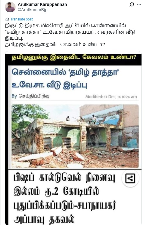”திருட்டு திமுக மிஷினரி ஆட்சியில் சென்னையில் “தமிழ் தாத்தா” உ.வே.சாமிநாதய்யர் அவர்களின் வீடு இடிப்பு. தமிழனுக்கு இதைவிட கேவலம் உண்டா?” என்று இந்த செய்தி பரவுகிறது.