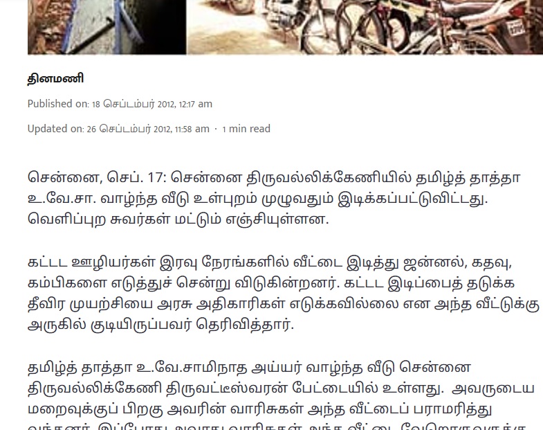 திமுக ஆட்சியில் தமிழ் தாத்தா உ.வே.சாவின் வீடு இடிக்கப்பட்டது என்பதாக செய்தி ஒன்று சமூக வலைத்தளங்களில் பரவி வருகிறது.