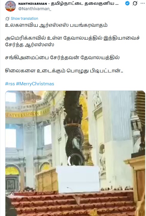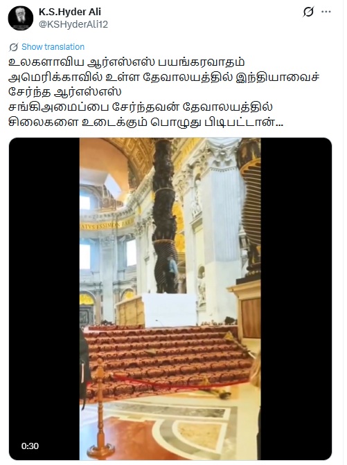 ” உலகளாவிய ஆர்எஸ்எஸ் பயங்கரவாதம் அமெரிக்காவில் உள்ள தேவாலயத்தில் இந்தியாவைச் சேர்ந்த ஆர்எஸ்எஸ் சங்கிஅமைப்பை சேர்ந்தவன் தேவாலயத்தில் சிலைகளை உடைக்கும் பொழுது பிடிபட்டான்” என்று இந்த வீடியோ பரவுகிறது.